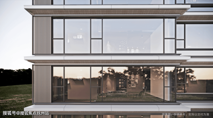中海此次将产品外立面进行了创新,在外立面设计上,沿袭现代轻侘寂风格,设有屋檐设计,精美斜切角屋檐,此外还将木纹铝板材质运用到外立面,搭配银白灰色铝板、大面积通透玻璃窗,颜值很高。