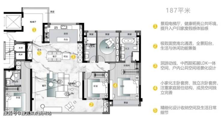 中海江湾境在产品设计之时,就已经考虑到建筑与自然的交互,在原有两梯两户私密候梯基础上,增加了北向飘窗(建面约155-187㎡均有全明候梯厅空间,建面约199㎡存在差异),将候梯厅变成全明,同时兼具收纳属性和实用性,休憩座位和窗外的风景,都让等待变成了一种享受。