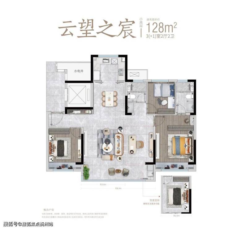 建面约128㎡的户型,约6.4米宽厅的景观阳台+落地窗设计,其中让业主享有约270°阔景视角,主卧带卫生间的设计,私密性也更强。