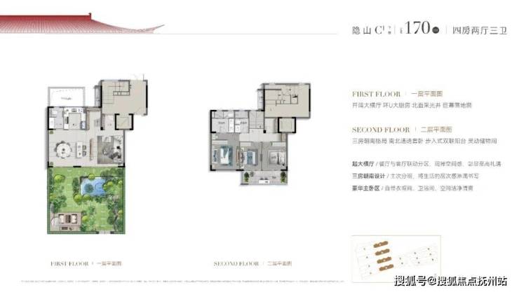 比如建面约170㎡的双层下叠四房两厅三卫,约9.7米面宽,三开间朝南的大四房格局。约6.9米面宽,两房朝南;南向房间一字拉平,北向也设置房间,但确保每一层空间,与院落、阳台或露台衔接,迎接漫天漫地的阳光与月光。