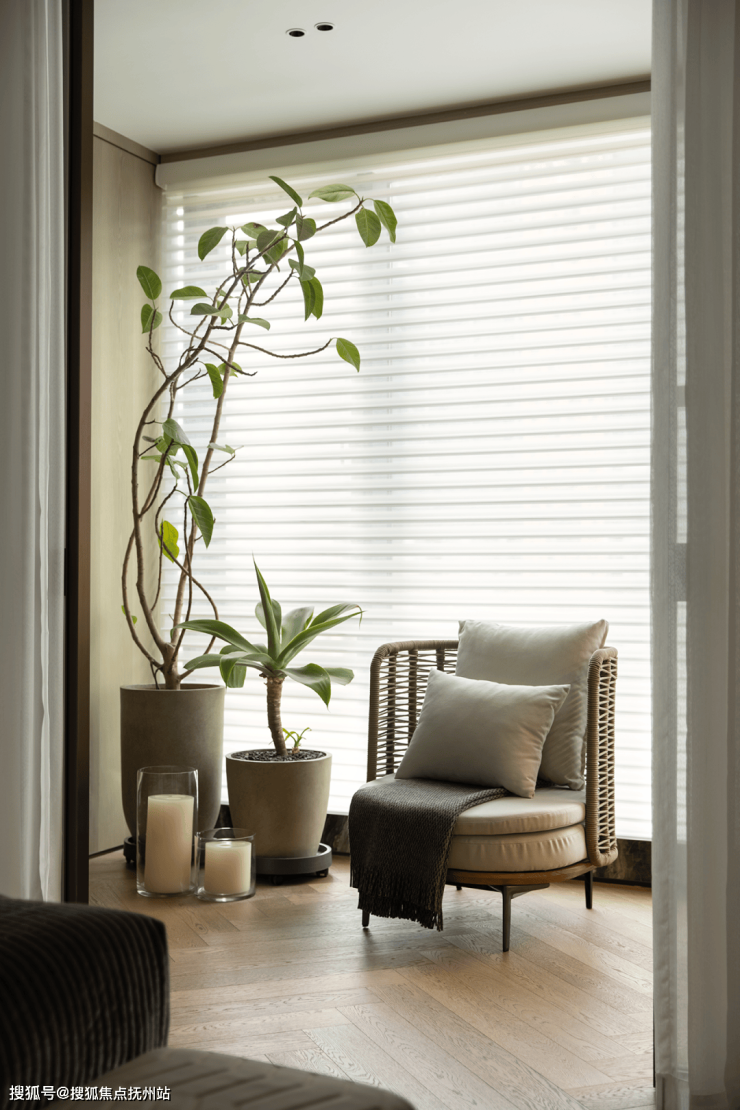 与自然共生,体验质感生活。客厅以米白和棕色为主色调,呈现出雅致而简约的空间氛围;融自然美学于现代高品质设计理念中,在绿意盎然的植物中延展出客厅空间的开放属性,定格家庭聚享时刻。