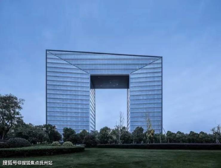 全幕玻璃和拼配铝板,搭配游走交叉的金属线条赋予建筑物通透干练的效果,转角内约5.3°的微斜切面,视野更好,造型也更加流动,湛蓝的玻璃幕墙反射出钱塘江的东去的水波,也见证了之江拂晓晨曦间的车水马龙。