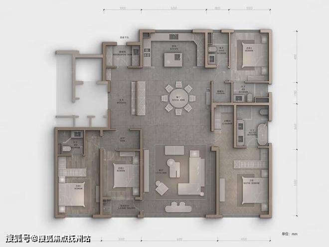 建筑面积约255㎡的户型,由CCD香港郑中设计事务所设计,同样配备有摩根智能家居系统。四室两厅四卫的设计,户型方正,餐客一体化,开间达到了约6.1米,会客彰显气度、生活从容有度。