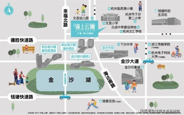 锦上云澜所处的元成单元,位于德胜高架的北侧,这里还有一个更为响亮的名字——杭州医药港小镇。德胜高架以南区域即为金沙湖板块,以北为元成单元。