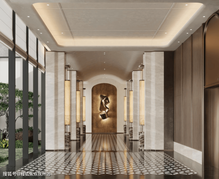 艺术长廊悄然引导着空间的转换,大理石廊柱庄重有序,大理石拼花地板延伸出优雅的几何韵律,每一步都让人沉静下来。