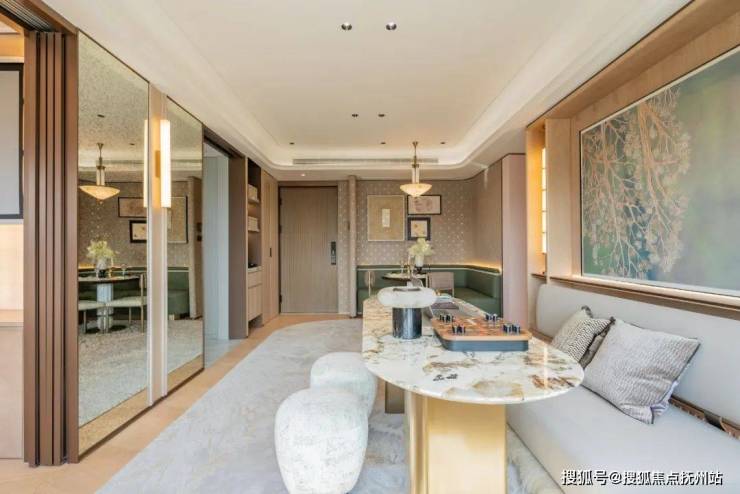 公区设计方面,该户型实际是南北动静分区的设计,南面主次卧休息区域,北面客厅联通餐厨区和水吧台,格局相当方正,避免了面积浪费,也让视野几无遮挡,进门就能感受到大宅气度。