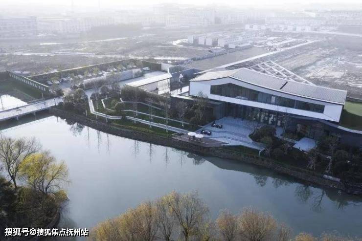 示范区后场面对水质良好的西周直江,设计团队打造了滨河景观带。沿建筑玻璃立面处设计的平台空间可用作室外洽谈区。景观设计采用现代市政手法,树阵广场结合草坪,局部种植花卉。人们于沿河外挑木平台上休憩,可观看沿河风光。草坪、花田、滨河景观打造出“花梗渔唱”之景。