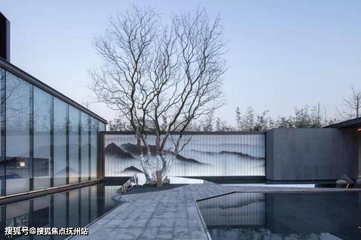 景观门楼既是入口,也是前场的景观连廊。步入连廊,一面内置水乡特色山水绢画的U玻景墙展现在人们面前,水墨韵味满盈。