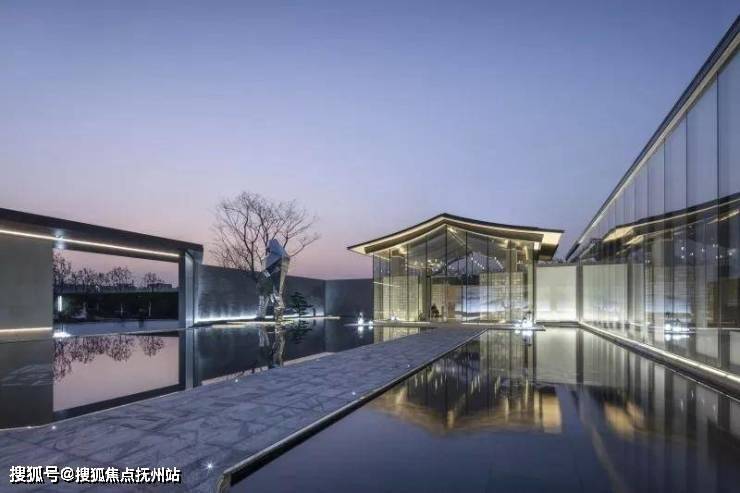 穿过大型玻璃构筑,走进前场。门楼前开阔的广场,昭示了元垄·华著“现代化、城市化”高端楼盘的定位。穿过西周直江上的景桥,即可看见景观水帘,水流淅淅沥沥地流淌,灵动悦耳,与简约的门楼相互映衬。踏上台阶,超大水面映入眼帘,水中倒映着简约现代、充满绍兴特色的销售中心建筑。