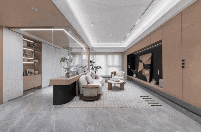 如果是以悦己需求为出发点的两口之家,可采用玻璃、推拉门的方式做软性分割,打造与客厅相连、又有一定的界限的电竞房/阅读区。