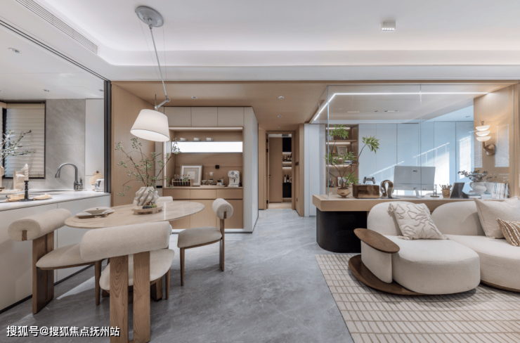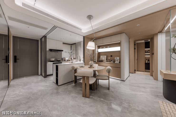 同时,用双向移门取代了两侧的固定墙体,将过去单一的中厨烹饪区调整为兼顾中厨烹饪、西餐操作、陪伴岛台的多功能复合厨房。向餐厅打开的南侧岛台更能作为家庭成员的咖啡角或是一人食的自在空间,将一贯被忽视的餐、厨衔接地带彻底激活。