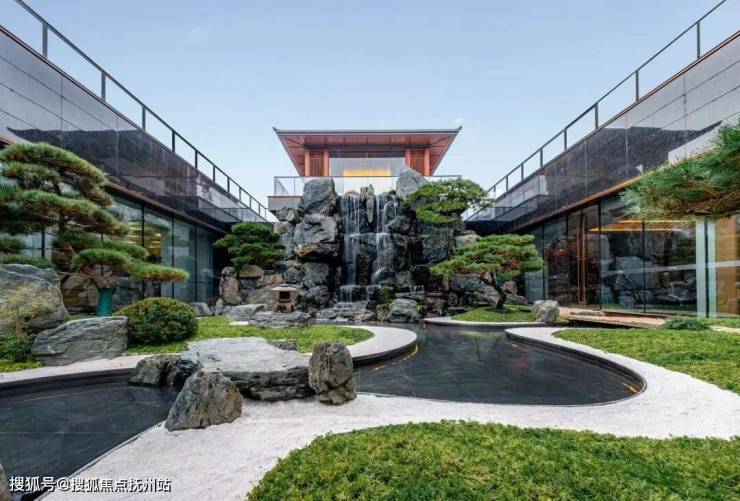 穿过会所,便是灵感源自北京悉昙酒店的下沉式庭院。以“高山流水”为核心理念,营造出瀑布叠水、松石掩映的立体山水画卷。中央景亭复刻宋代《雪景寒林图》意境,尽显东方禅意。院内还种植了大量的造型松,形成了多层次的绿化景观,让每一次归家,都成为穿越园林画廊的诗意旅程。