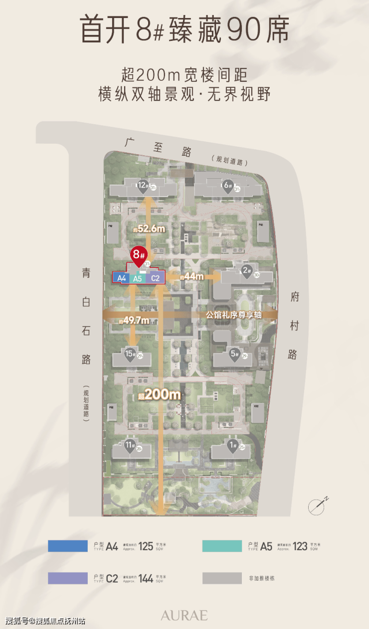 整体规划中,纵向中央绿轴超200米,横向景观轴约140米,南北楼间距约50-57米,东西间距也多超过44米,实现更好的采光通风效果与景观视野!