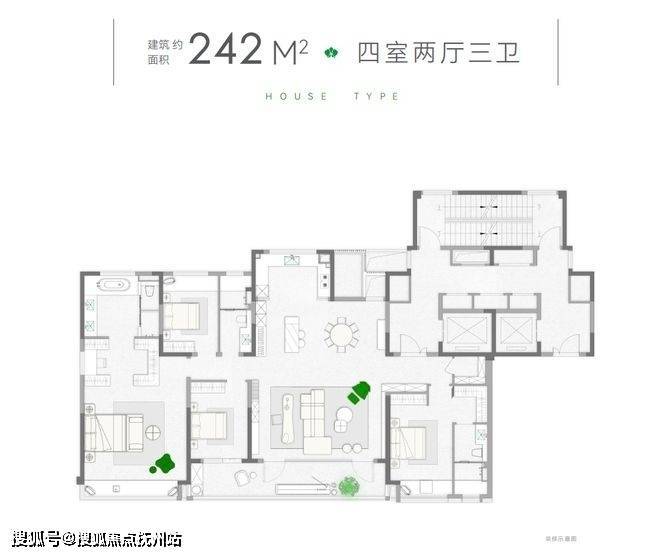 建面约242㎡4房2厅3卫户型,约20.7米南向面宽+两个朝南主卧套房+三个明卫,整个户型空间开阔明朗,动线一气呵成,诠释了真正大宅的空间尺度。