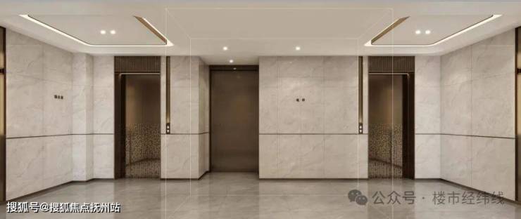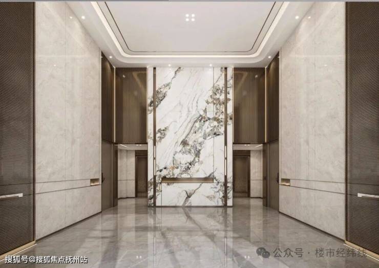 单元门厅部分采用了首层挑高,并且是双精装大堂设计,单元门头采用美国“世纪白金”石材和铝板单元门采用双层挑高高标准精装入户大堂。门厅背景墙采用爱马仕金华白岩板打造(造价极高)