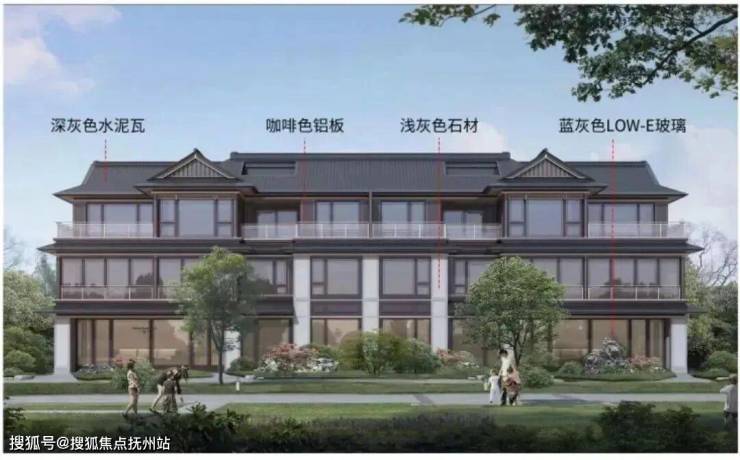 效果图上来看,外立面为新中式风格,由深灰色水泥瓦、咖啡色铝板、浅灰色石材、蓝灰色LOW-E玻璃组合而成。