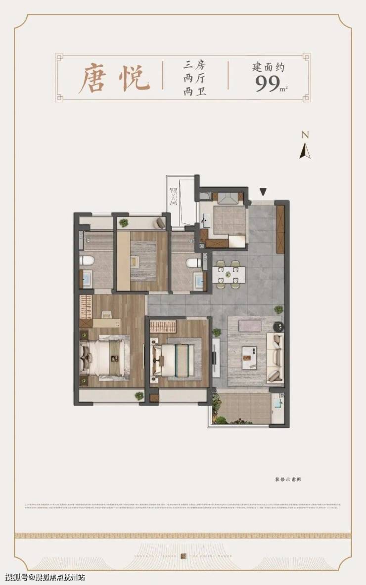 约99㎡3房2卫,汇聚了市面上优秀户型应该有的大多数特质。