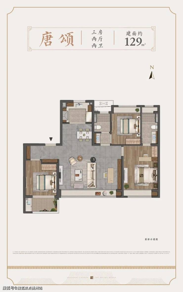约129㎡做到了市面少有的四开间朝南,配以南向大横厅客厅,社交空间的尺度感在同级中是“奢侈的”。