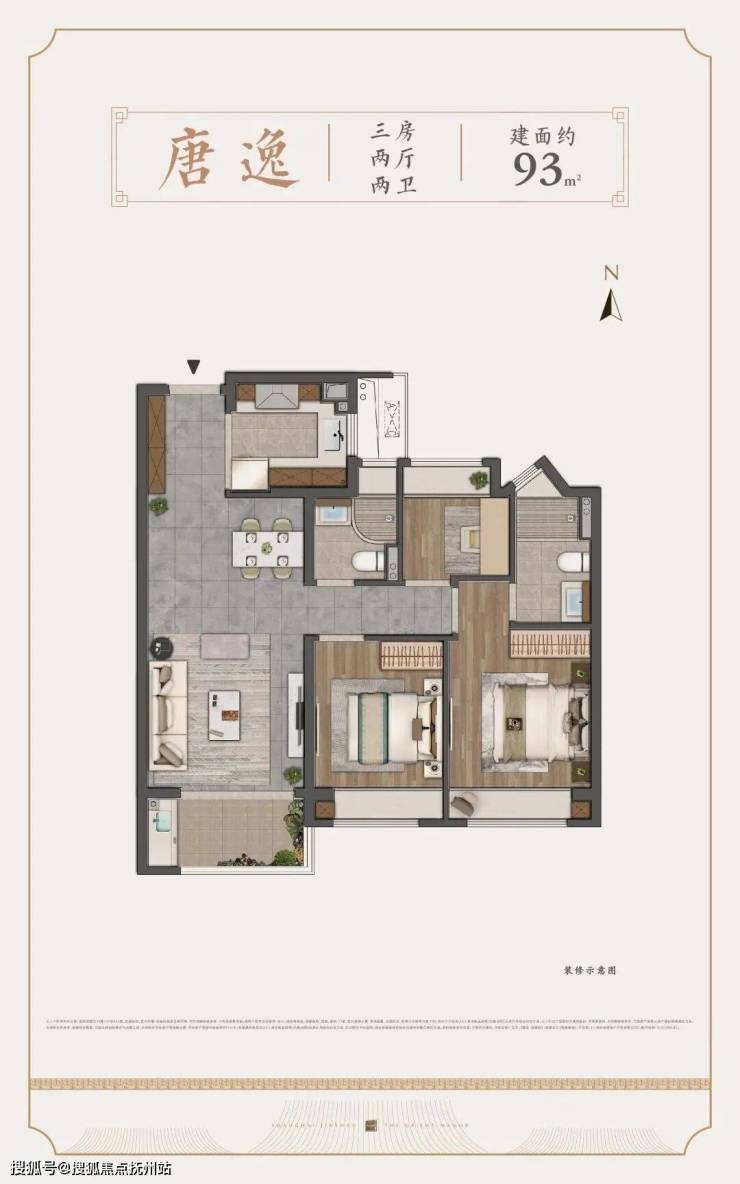 约93㎡的户型,3房2卫的格局,比市面常见的户型多了1卫,可避免早高峰抢厕所的尴尬。