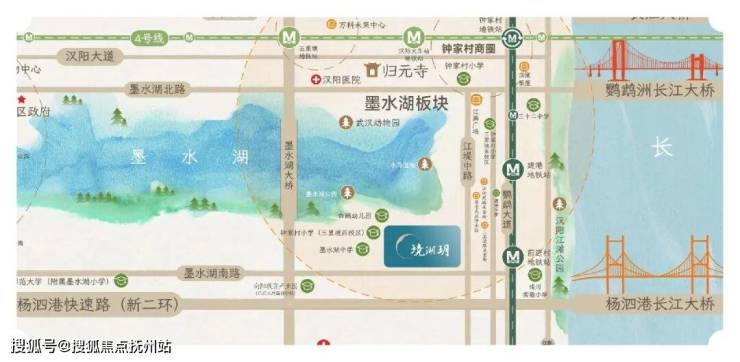 汉阳二环核心,墨水湖东南岸。交通路网四通八达、二环内最大湖泊公园、全区顶配教育资源,奢华配套定义汉阳四代生活。
