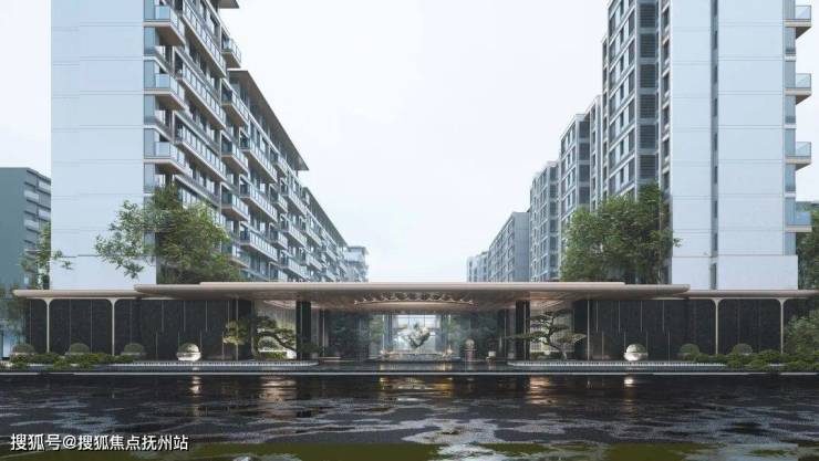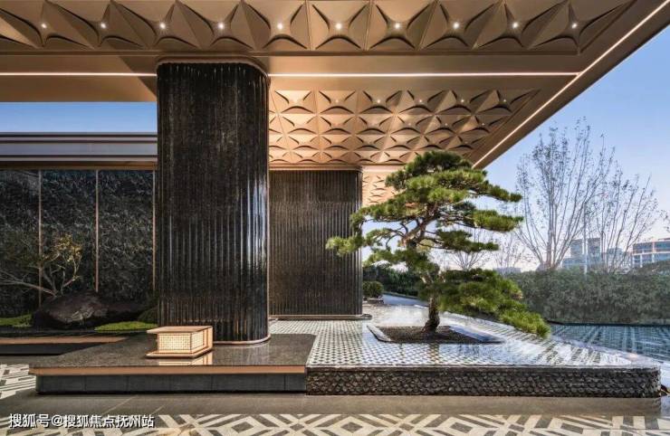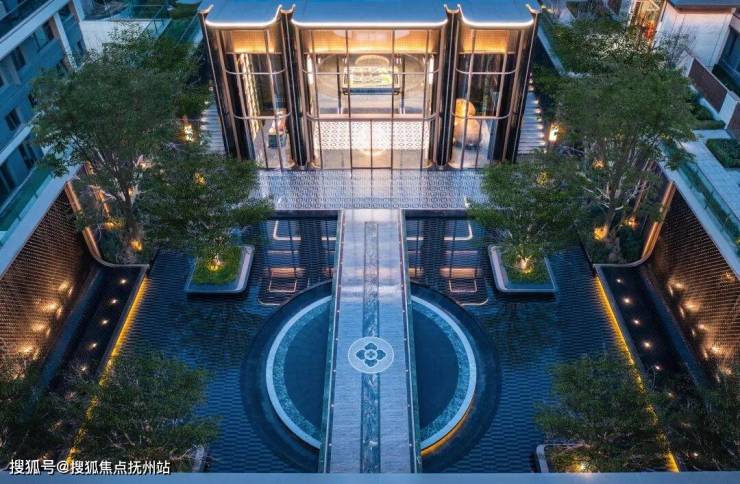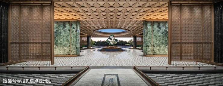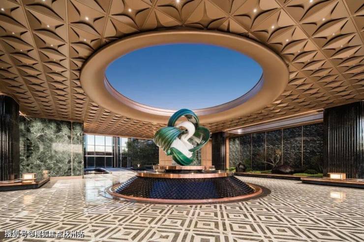 作为归家的礼仪门面,翡月之门凝萃着绿城对时代美学的极致思考, 66米奢石落客区、奢华酒店式归家大堂、约1600㎡架空泛会所、立体式花园建筑、顶跃高厅、奢适空间;酒店式礼序入口,松礼迎客,中心处的水景叠级呈现,结合雕塑营造入口仪式感及尊贵的归家体验。对于材质的选择与组合、形体比例的推敲、拼接面的分缝与拼合等工作的精细考量,提取时代的花纹,巧妙设计在空间里,让空间不经意地流露历史的品质。