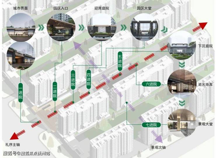 规划设计上利用贯穿围合的下沉庭院,多级立体的生态花园,使单一的空间被赋予丰富的层次,呈现生态花园般的视觉效果,结合社区入口,打造1.6万㎡ 全维实景示范区。