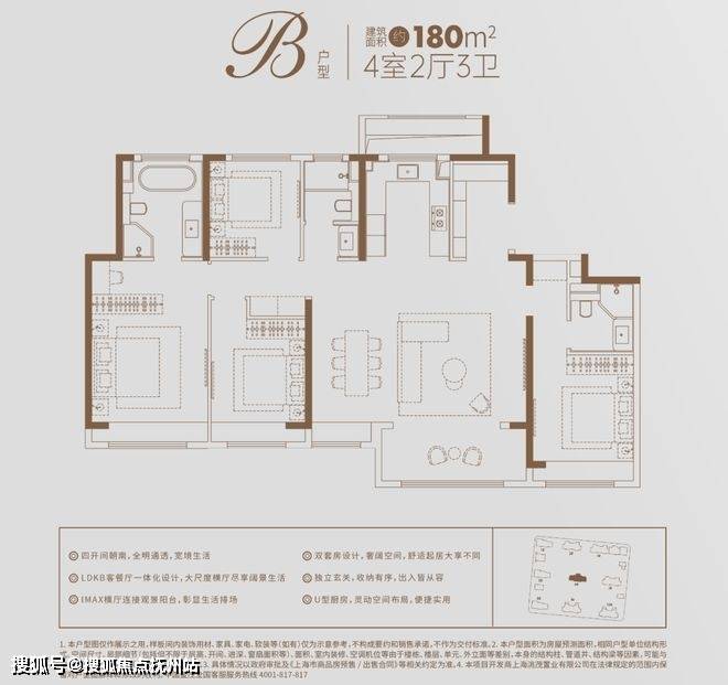 五开间朝南的全明通透,四房两厅三卫,双主卧设计,舒适起居大享不同,使得其居住感相当阔绰,为生活增添更多情景体验。在精巧铺排上,LDKB客餐厅一体化设计,大尺度横厅尽享阔景生活;动线合理的基础之上,户型格局方正,赋予生活幸福美感。