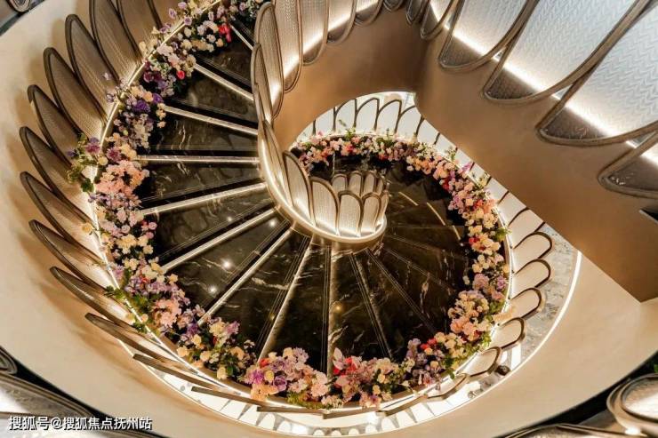 摩登旋转楼梯。楼梯已经贴上了定制的叶片状玻璃栏杆,朦朦胧胧的透光感,将会所旋梯的审美力,又拉上一个全新的高度。