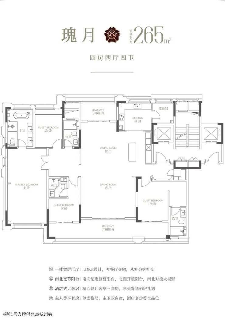 建筑面积约265㎡洋房户型独具四大产品优势。约19.7米面宽,四开间朝南,餐厨一房朝北设计。强调家庭亲聚、风景交流为理念,引入LDK一体化中西厨和客餐厅动线的无缝衔接设计。精研空间美学,迭代每一处细节:独梯独户尊崇规制,主卧专属全维度衣帽间,奢配私属入户玄关,于方寸间赋予日常以高阶仪式感。北向城景X空间、整体完美面宽与进深比例,既有舒适空间,又满足用户所需的“非基础功能空间”。