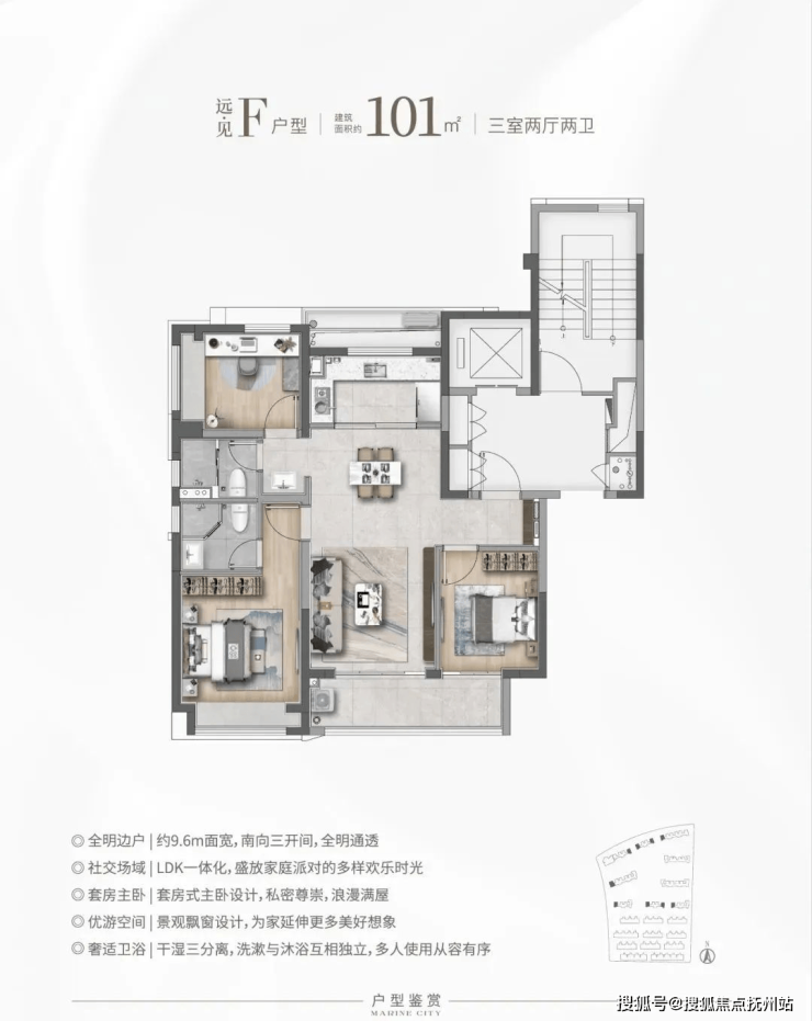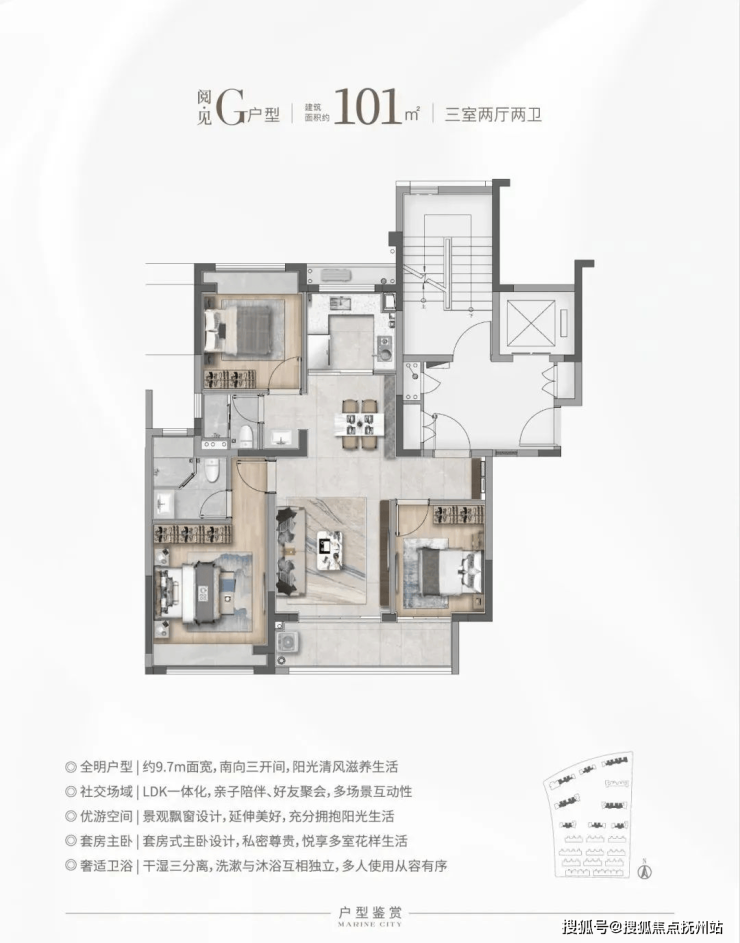 H户型:瞰·见 建筑面积约101㎡,三房两厅两卫