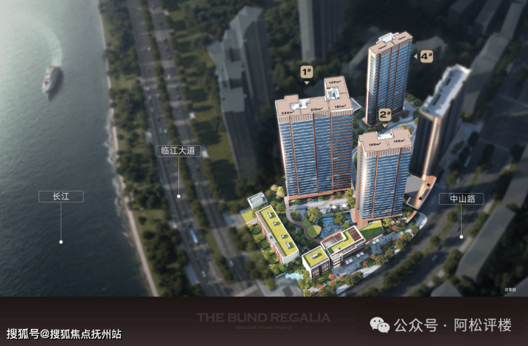 从平面图看,该项目首开的1、2号楼均南向偏西朝向,1号楼有1个单元是东南朝向背江,1、2号楼预计各个户型都有一定看江视野,但估计只有西边套户型能做到正面看江和270°观江。