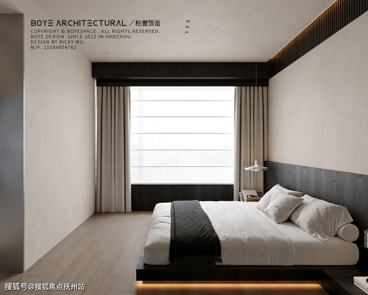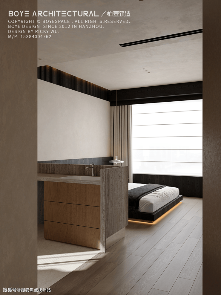 卧室内睡眠区采用地台床的设计,造型简洁且不失设计感。以“少即是多”的克制美学,剔除了一切非必要的装饰品,让这里回归睡眠本身的纯粹。