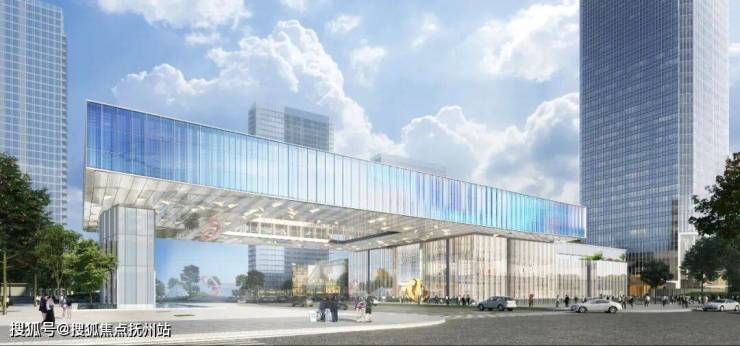 在南侧主入口,“瓯江之门”以钢桁架大跨度商业空间,上跨主入口,形成强烈的视觉冲击力。