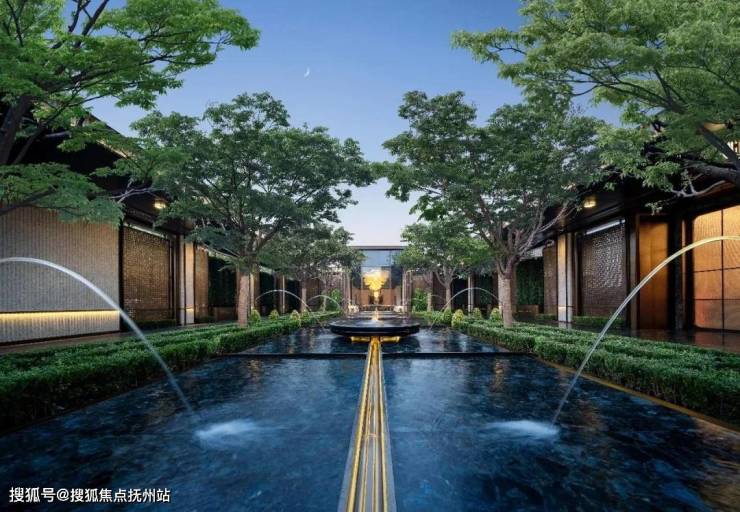 门口是很有对称仪式感的车马院,进门是高度对称的长廊水院,围绕着地面归家大堂展开的架空层、亭廊,以及围绕着下沉式庭院展开的会所空间,同样讲究「中轴对称」。