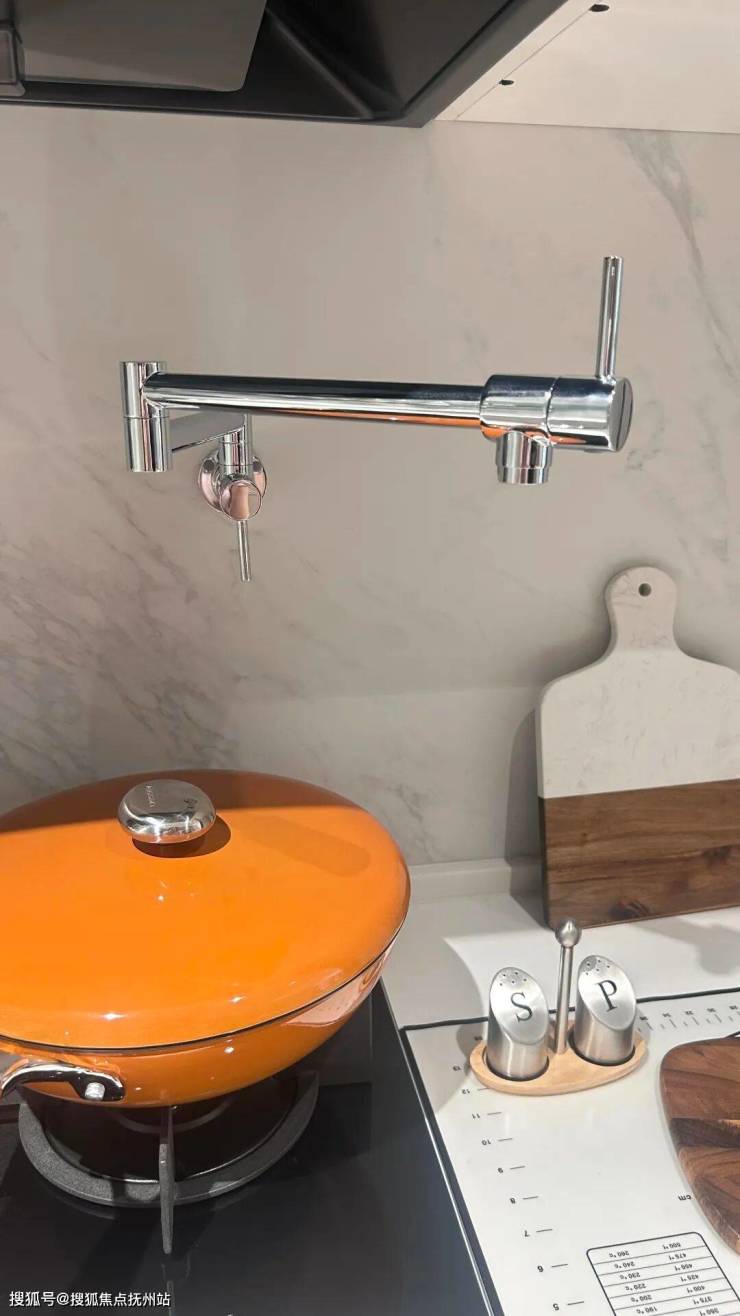 厨房超大柜体的收纳空间,包括调味拉篮、岛台双面收纳,将厨房空间直接扩容约80%,贴心的灶前龙头设计,开火时直接上方接水,非常灵活;