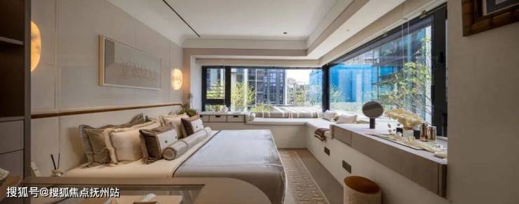 主卧拥有270度环幕飘窗,视野和采光优越,配备了高奢卫生间,空间感、尊崇感拉到顶格。