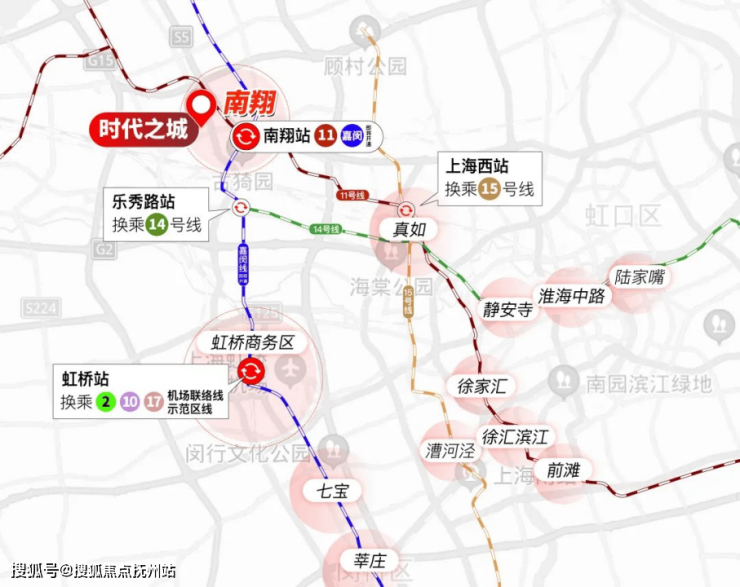 交通上,时代之城所拥有的11号线+嘉闵线双轨通勤,距离地铁11号线陈翔公路站约900米,半小时就能到达徐家汇等市区核心腹地。包括静安寺、徐家汇、徐汇滨江、漕河泾、陆家嘴、新天地都在业主的生活圈内。