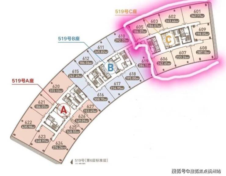 519#B座最小出售单位:整层(5-17层)约2.6万平