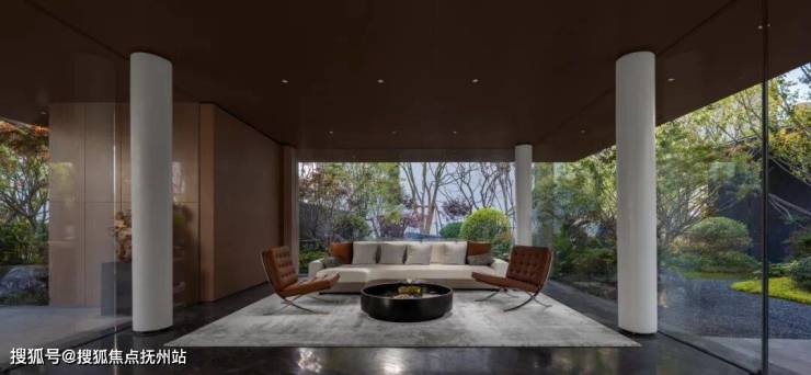 三面环绕的落地玻璃可全景欣赏社区绿化景色,开阔视野提升社区人员在此停留时的观感体验,玻璃材料应用也模糊了室内外关系的界限,达成建筑室内景观一体化。