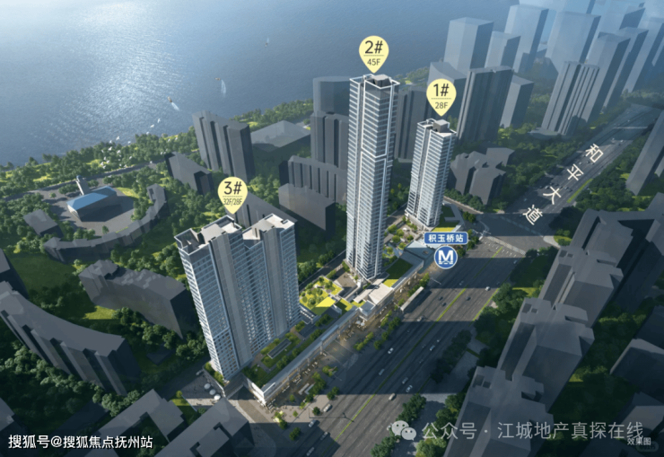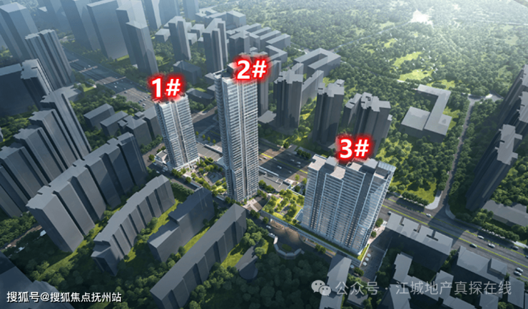 根据规划,项目由2栋高层一栋超高层组成,其中1号楼总26层、2号楼45层、3号楼32层,整体布局一字排开沿和平大道分布,具体楼栋分布如下图。