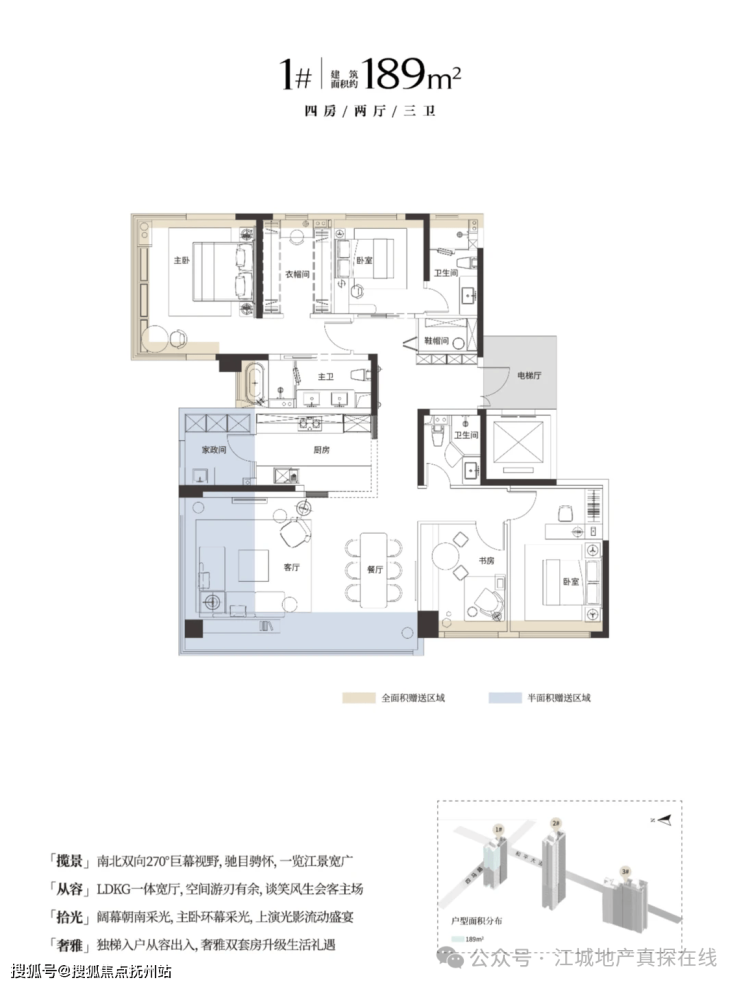 1号、2号楼东侧靠近和平大道为149平户型,西侧3-15层为153㎡;16层及以上为189㎡看江房源;3号楼为146㎡、153㎡和189㎡户型组合。