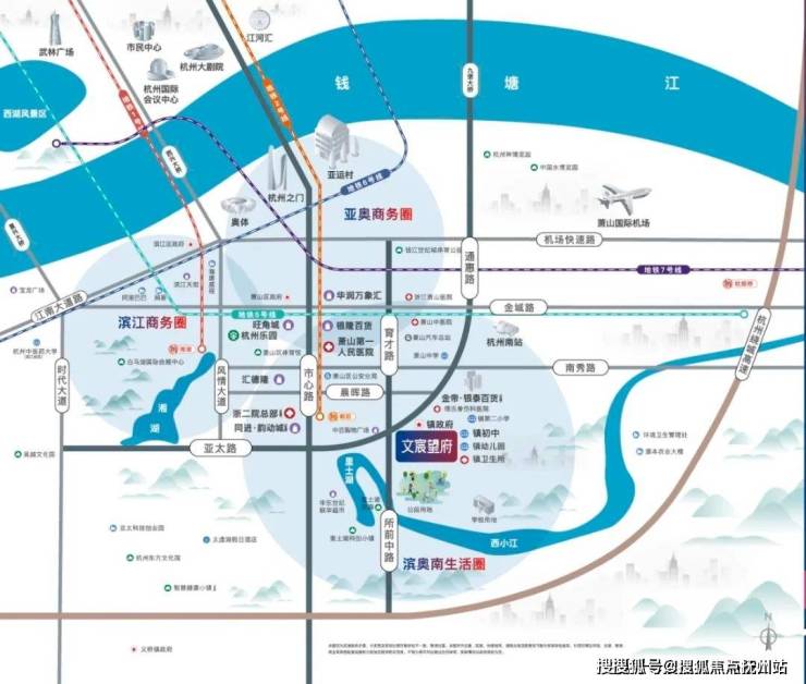 将视线聚焦滨奥南,文宸望府无缝衔接着都会CBD生活。在项目周边,不乏跨越升级中的产业园区与焕新的城市配套。同时,项目距地铁2号线朝阳站仅约2公里(直线距离),市心路、通惠路、风情大道、时代大道四大黄金动脉快速链接奥体、钱江新城等中芯地段,生活出行从容有序。