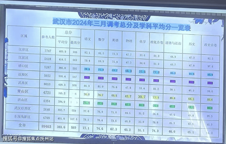 武汉市2024年三月调考总分及学科平均分