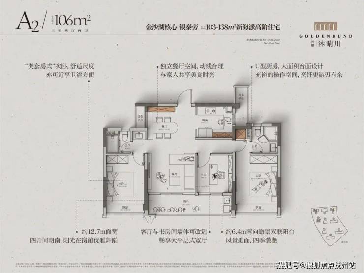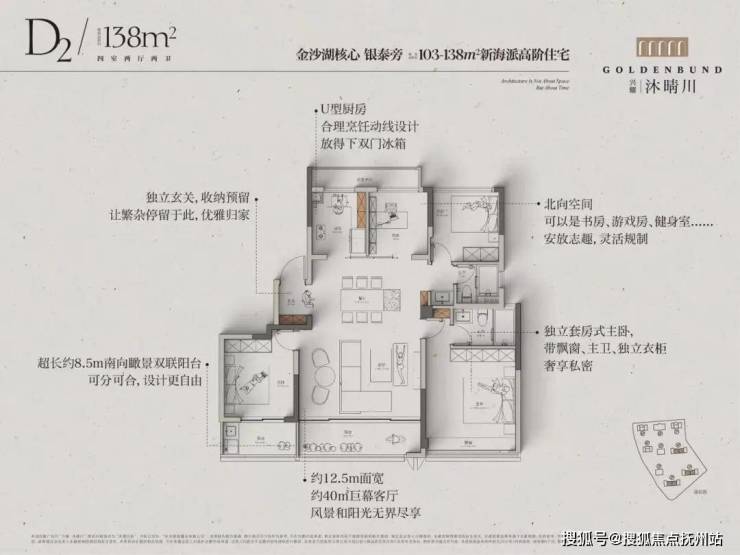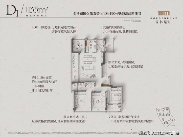 全一梯一户小高层133-138㎡:客餐厅进深约6.2米,加上阳台,整个公区的建面约40㎡,相当阔气。南向三间卧室,次卧还连接一个生活阳台。拥有市场上很罕见的约8.5米超长双联阳台,可分可合!