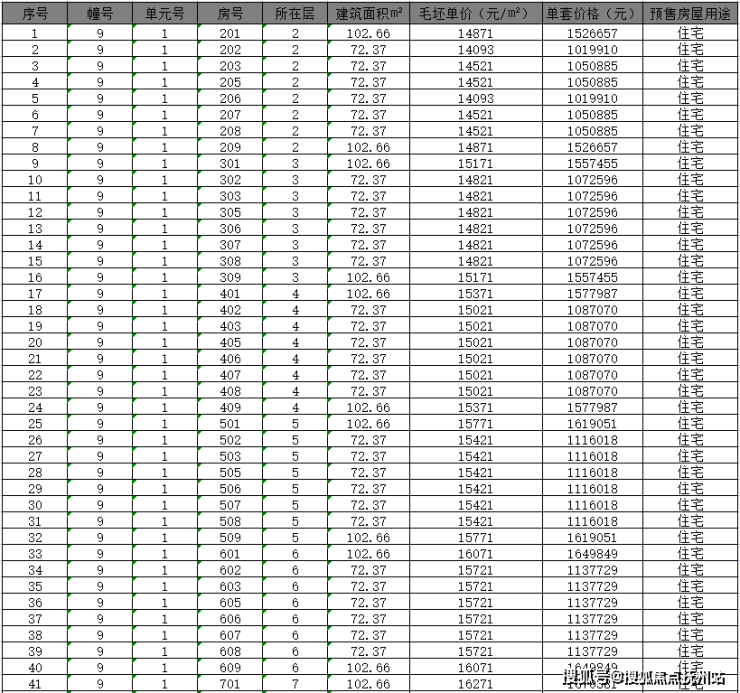 一房一价预售价格表