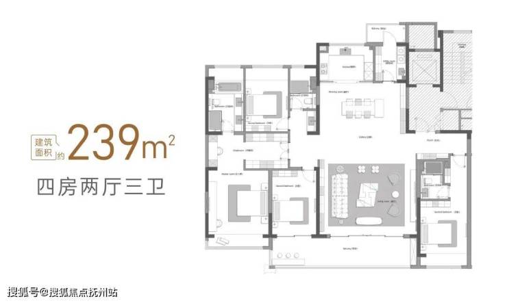 • 瀚月(约239m²):四房两厅三卫,四开间朝南,双联阳台,宽幕阔景极致体验LDKG设计,总统级套房主卧,步廊式酒店衣帽间。