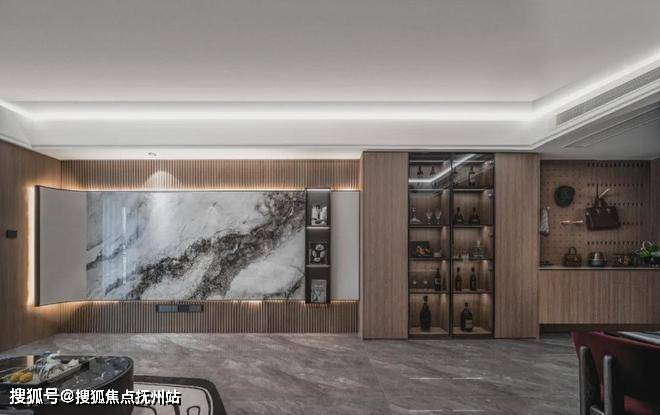 第四,就是它的大面积岩板+玻璃酒柜“超额”配置设计。