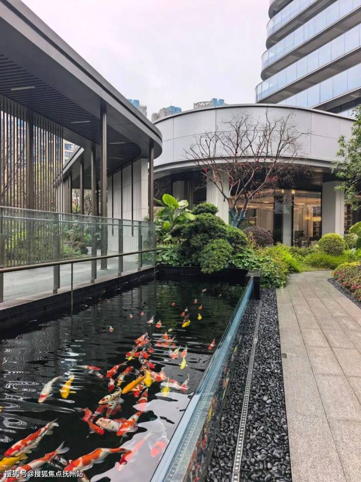 项目虽然只有4幢大平层,也单独围合出了一个小型的中央园林。园林主要配置包含风雨连廊、中央草坪、水景、锦鲤池、儿童游乐区等,而它应该也是目前唯一配备锦鲤池的项目。当然槽点也有,直观的可以看到二楼露台因为没有配置空中花园或者其他景观,目前已经明显有“脏感”了,作为1800万起步的项目,这个观感确实不佳。