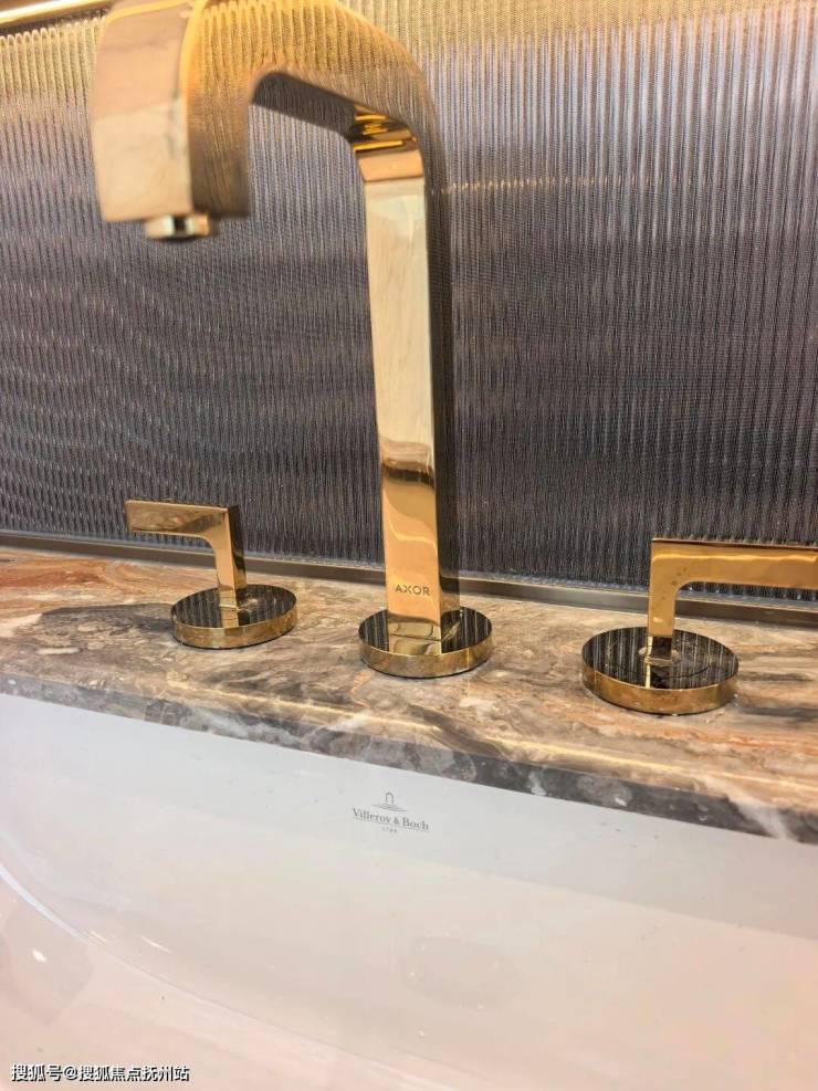 再看主卫配置,主要石材目测是雪花白,浴缸是英国VA,和海潮望月同品牌,台盆唯宝,龙头金色雅生AXOR,汉斯格雅金色花洒,马桶唯宝智能马桶,土豪范儿拉满,整体配置略低于海潮望月,优于T-ONE潮博。