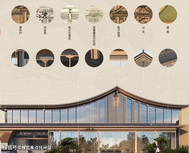研习《营造法式》之精巧,提取宋朝代表性建筑中的中式重檐屋顶、木作构件元素,甄选铝板、石材、LOW-E玻璃为主材,打造简雅秀逸的宋风公建化立面。